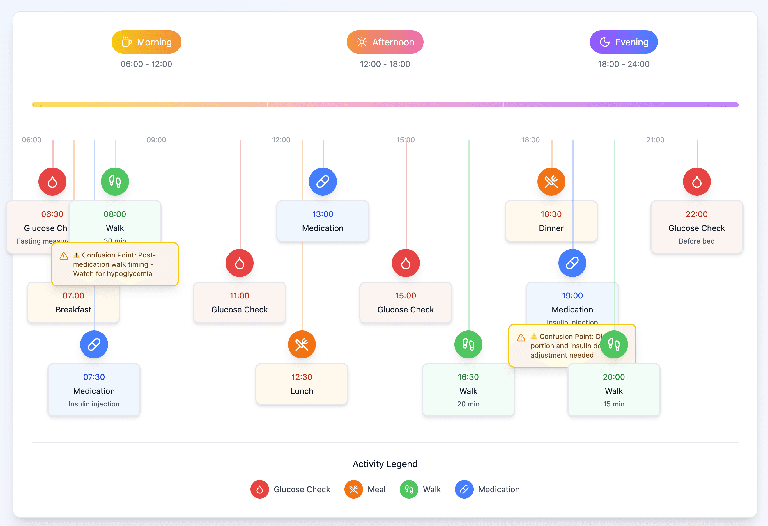 Visualizing the full care timeline to uncover hidden pain points across daily glucose, meals, walks, and medication.