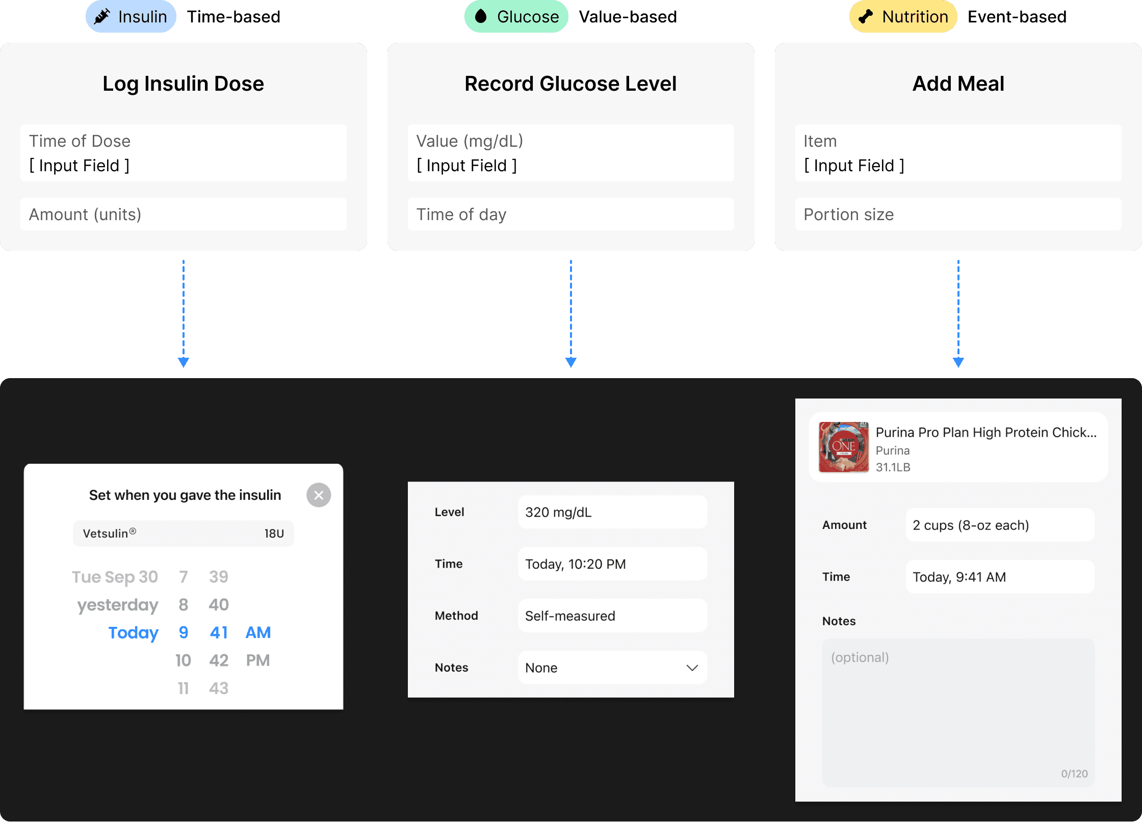 The result was a clear, MVP-ready experience built specifically for caregivers supporting pets with diabetes, connecting core routines into one guided flow.