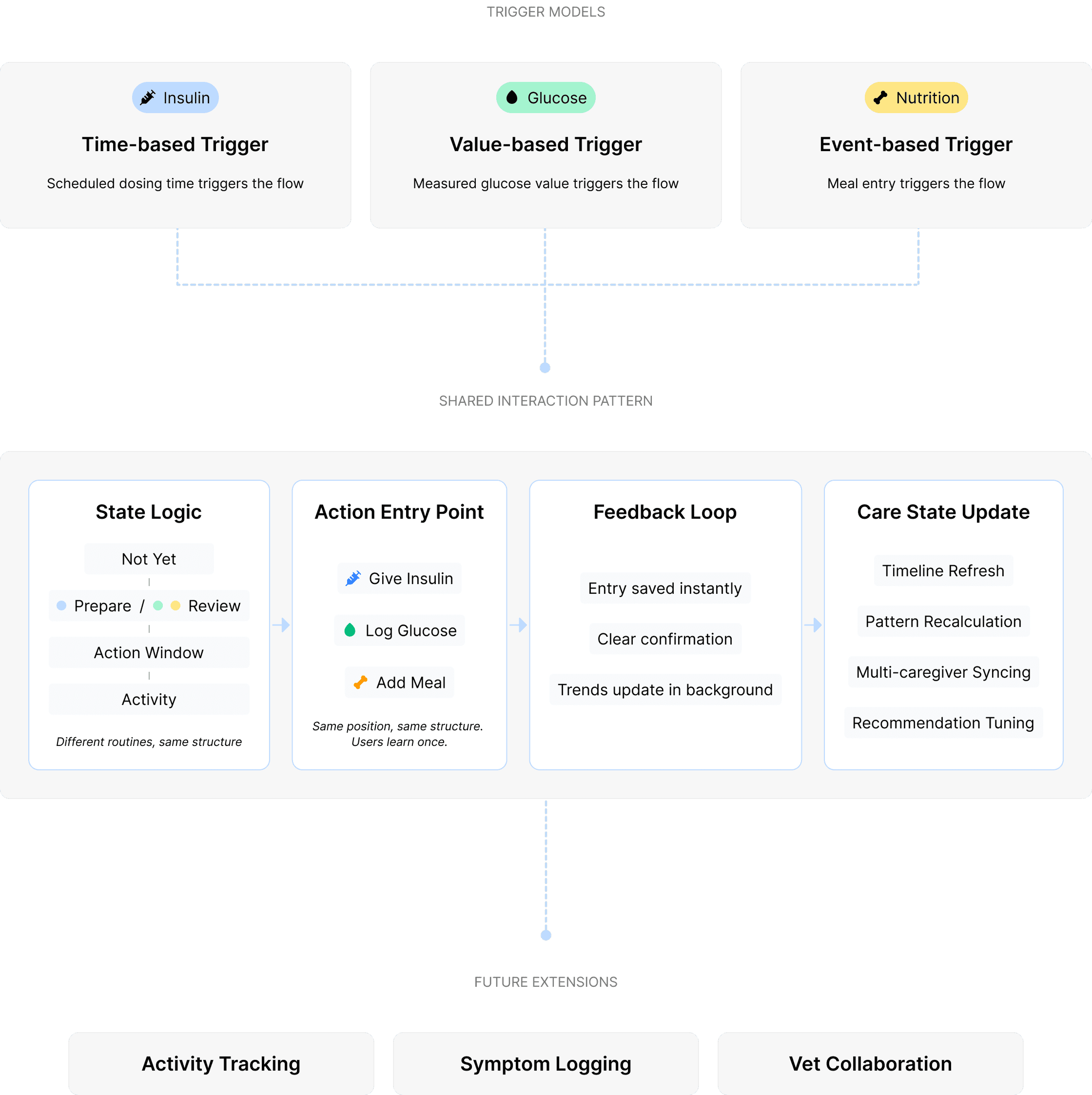 The MVP begins with insulin but the system was built to support more routines. Each routine uses different triggers such as time values or events but the experience stays unified through one state based interaction pattern.
