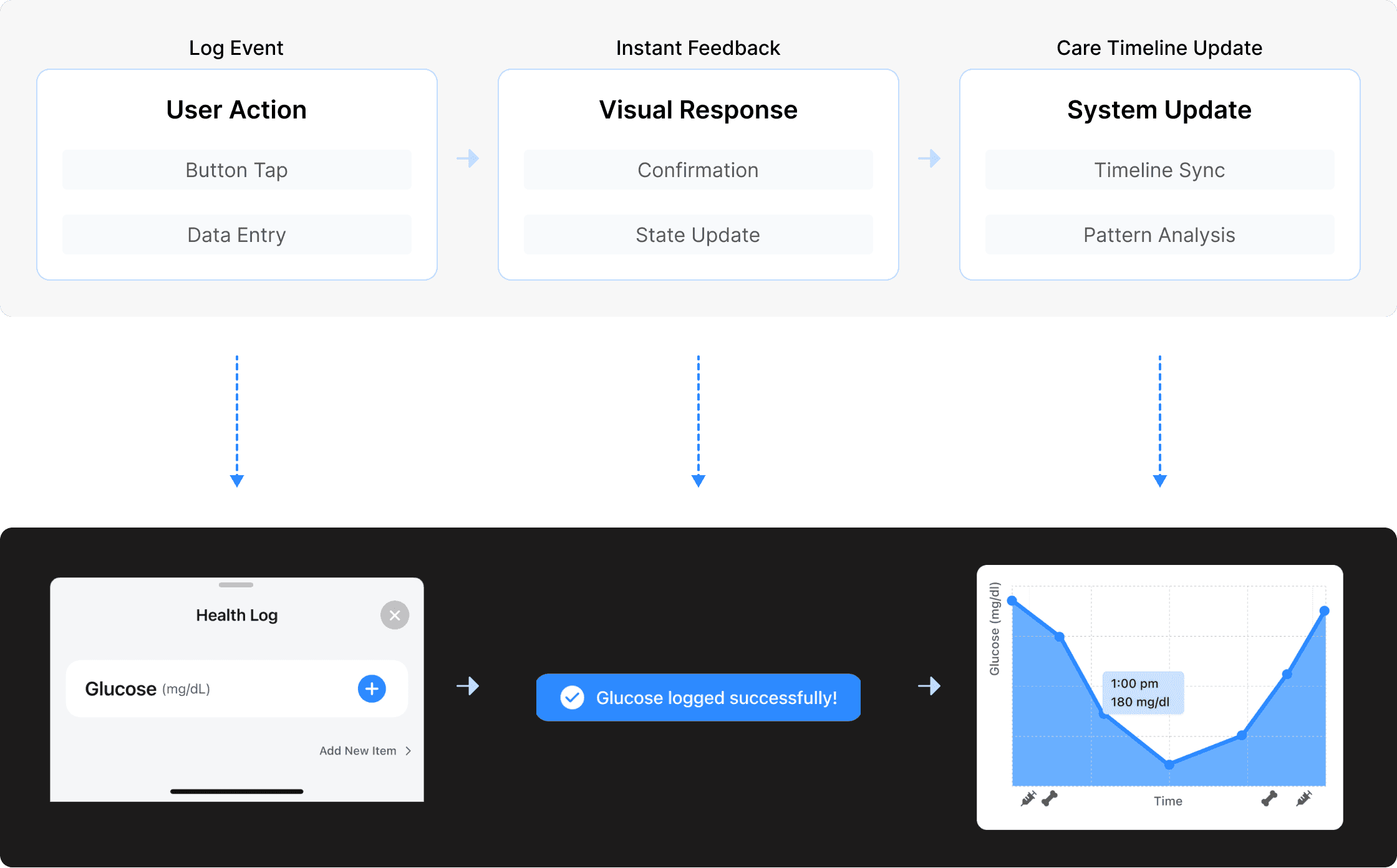 Log Event → Instant Feedback → Care Timeline Update.