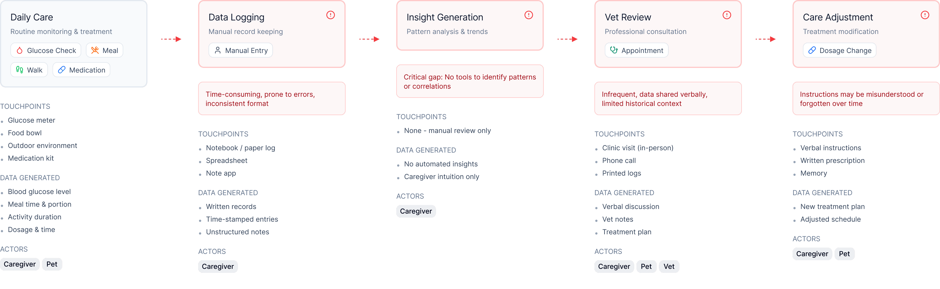 Journey map illustrating the current care process and its gaps across logging, insights, vet review, and treatment adjustments.